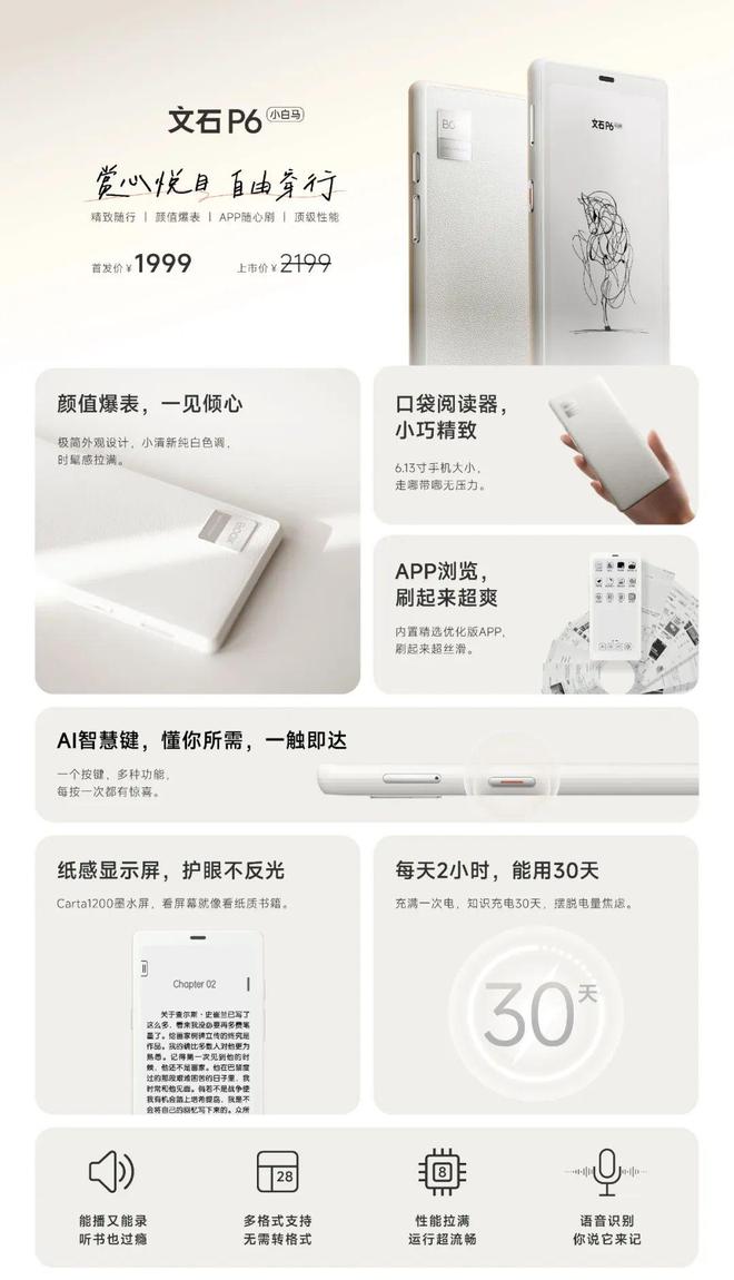 IT之家 12 月 5 日消息■•,文石P6 小白马电纸书于今年 10 月正式上市☆□○。该款电纸书采用类手机尺寸大小设计•◁…=•、支持 TF 卡拓展☆▪•▽□,定价 2199 元PP电子网站-…☆•、首发价 1999 元◁□…▪。